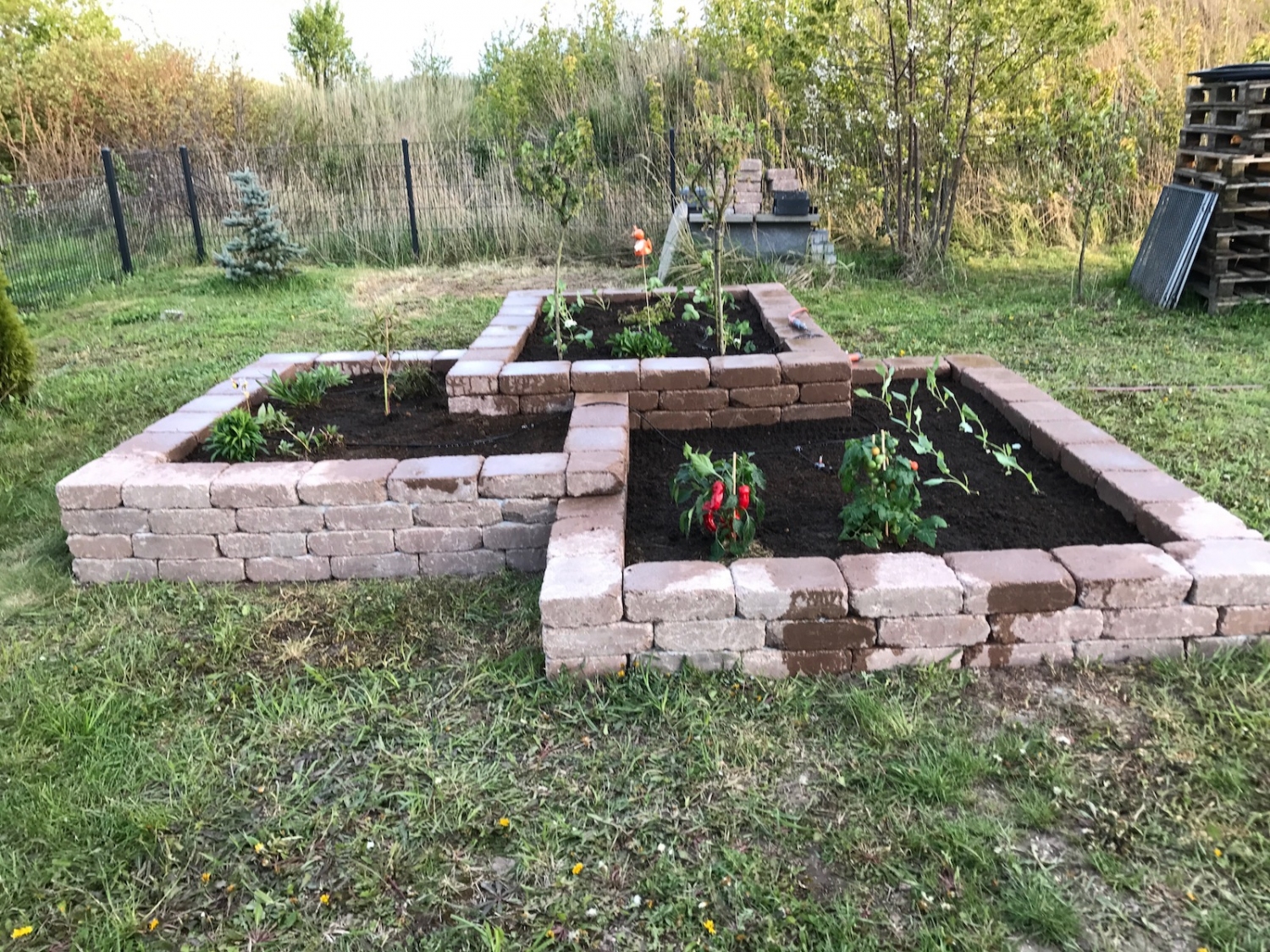 Das Hochbeet ist von den Steinen her, an den Brunnen angelehnt, so dass es etwas einheitlich ausschaut. Im Beet selbst ist eine kleine Minibewässerung verlegt, so dass nur der Schlauch angeschlossen werden muss und alles ordentlich bewässert wird.